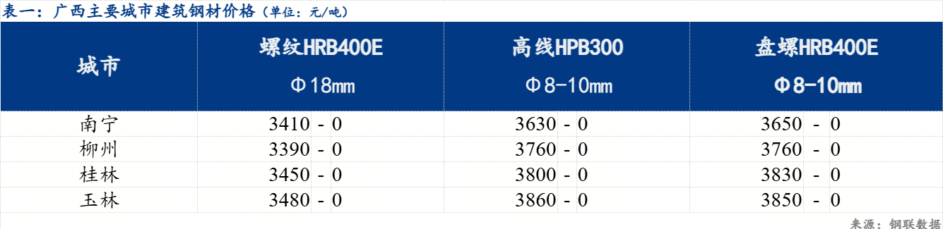 29日广西建筑钢材价格盘整运行。具体来看,南宁市场价格持稳,螺纹钢价格3410元/吨,盘螺价格3650元/吨;桂林市场价格持稳,螺纹钢价格3450元/吨,盘螺价格3830元/吨;柳州市场价格持稳,螺纹钢价格3390元/吨,盘螺价格3760元/吨。