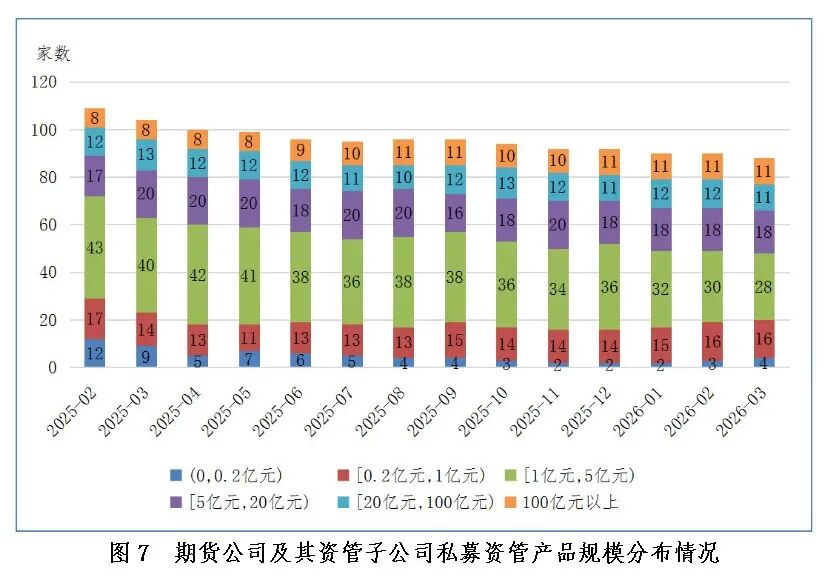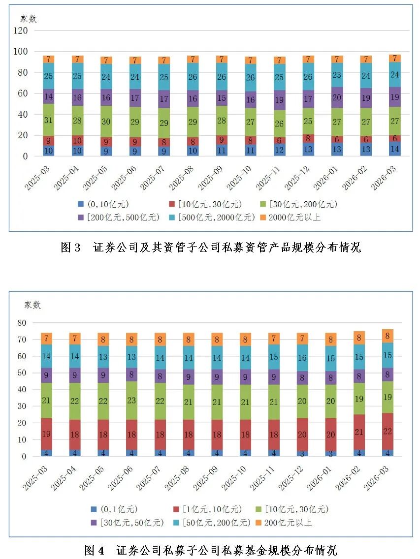 截至2026年3月底,证券公司(399975)及其资管子公司平均管理私募资管产品规模617.72亿元,管理规模中位数236.61亿元;证券公司(399975)私募子公司平均管理私募基金88.94亿元,管理规模中位数为21.04亿元;基金管理公司平均管理私募资管产品规模346.24亿元,管理规模中位数99.46亿元;基金子公司平均管理私募资管产品规模138.43亿元,管理规模中位数29.52亿元;期货公司及其资管子公司平均管理私募资管产品规模39.68亿元,管理规模中位数3.64亿元。(证券期货经营机构管理私募资管产品规模分布情况见图3至7)