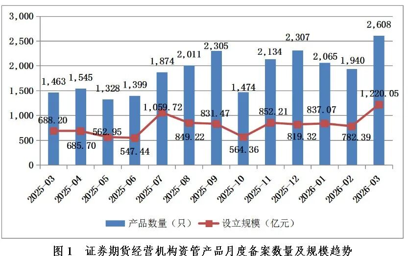 2026年3月,证券期货经营机构共备案私募资管产品2,608只,环比增加34.43%,同比增加78.26%;设立规模1,220.05亿元,环比增加55.94%,同比增加77.28%(见图1)。