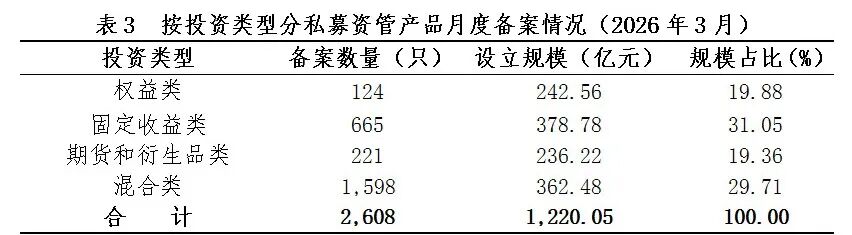 从投资类型看,3月备案的混合类产品数量最多,固定收益类产品设立规模最大(见表3)。