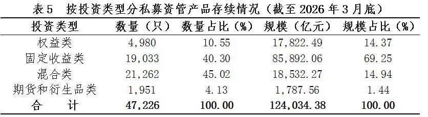 截至2026年3月底,证券期货经营机构私募资管产品规模合计12.40万亿元(不含社保基金、企业年金),较上月底减少947.01亿元,环比下降0.76%。(证券期货经营机构存续产品规模分布情况见图2)