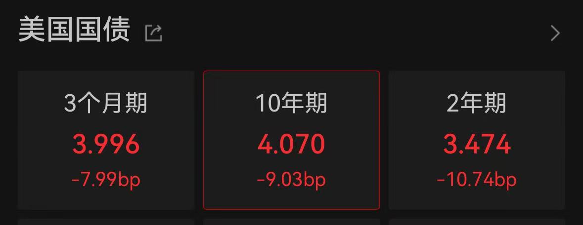 截至21:00,美国2年期国债收益率在非农就业数据公布后下降10.74个基点,报3.474%,10年期国债收益率下降9.03个基点,报4.070%。