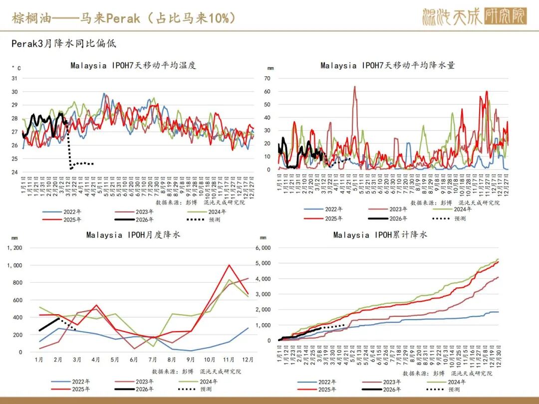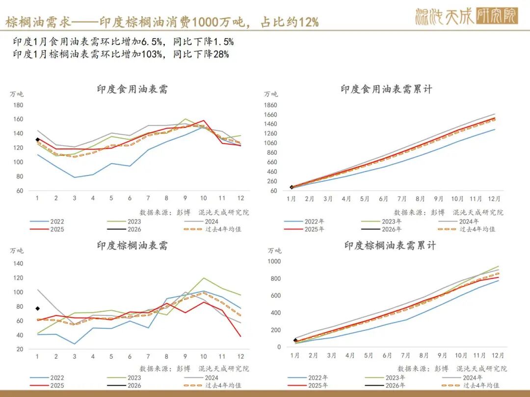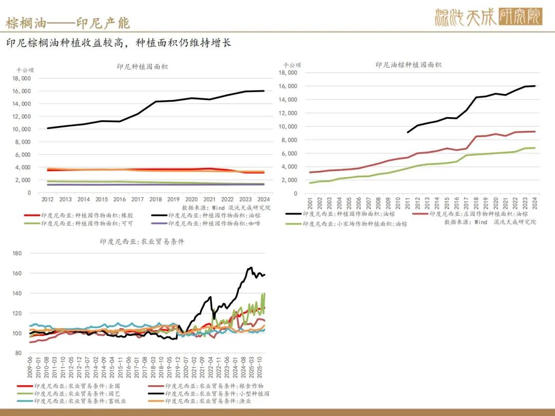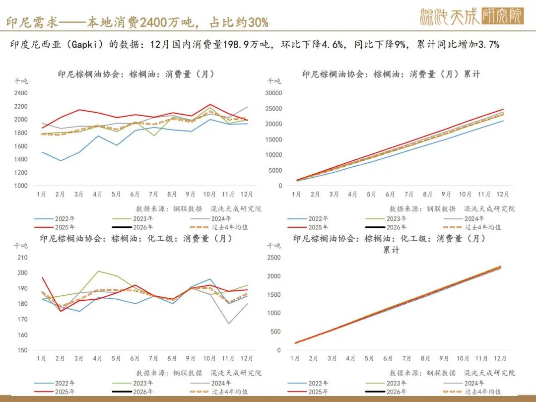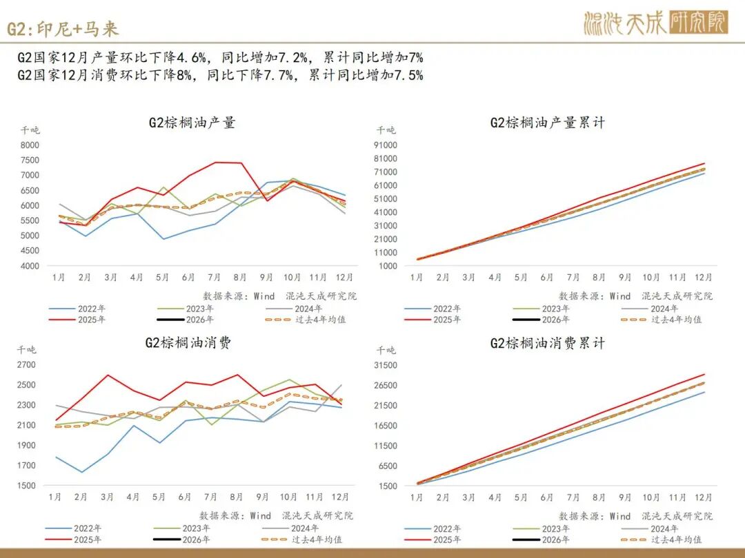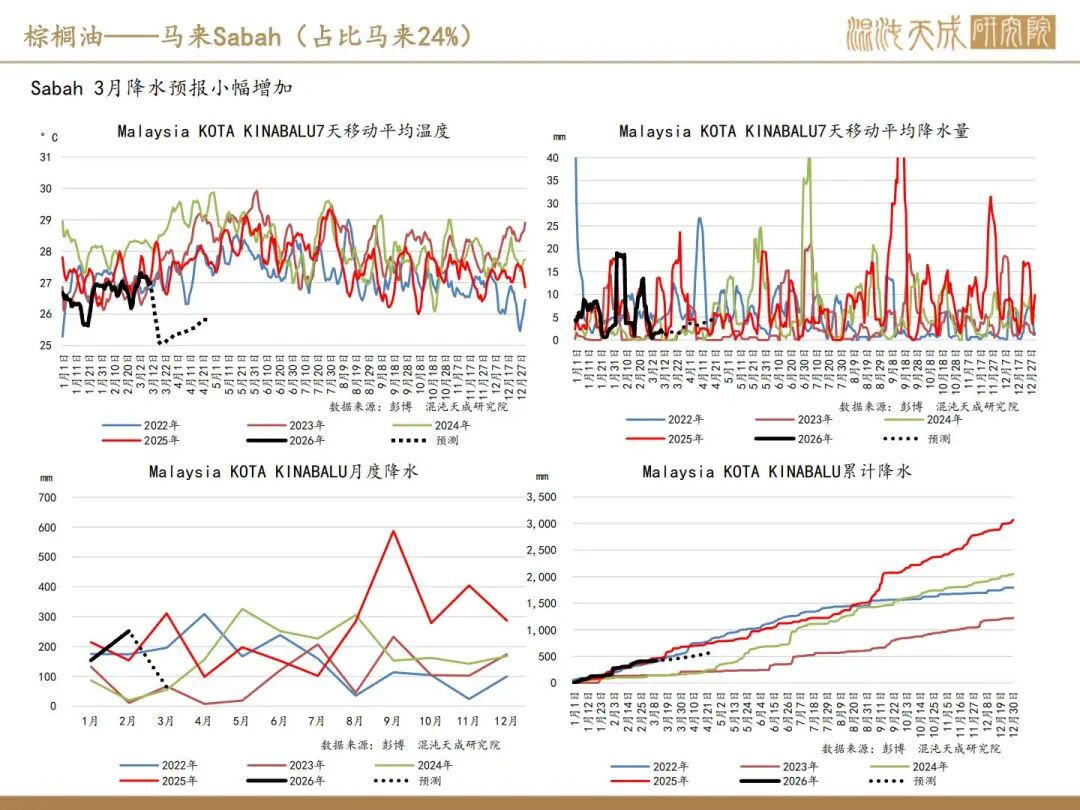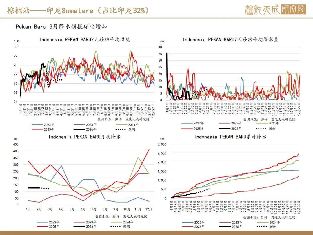 供给端:马来西亚棕榈油总署(MPOB)公布最新一期供需月报显示,马来西亚2月底棕榈油库存较前月减少3.95%,至270.43万吨,高于市场机构预期的263-265万吨;印尼气象机构警告称,预计2026年印尼将迎来比去年更长、更严重的旱季,干旱风险上升;印尼林业(884004)特别工作组发言人表示,该工作组已经没收了500万公顷的棕榈油种植园和工业森林特许权,其中170万公顷已移交给国有企业Agrinas Palma Nusantara;GAPKI:2025年印尼毛棕榈油产量同比增长7.3%至5166万吨。协会秘书长Hadi Sugeng表示,截至2025年底的棕榈油库存为207万吨,较前一个月下滑25%;印度尼西亚撤销了28家企业的许可证,并表示违规行为导致了洪水灾害,这些许可证涉及林业(884004)、种植园和采矿特许权,覆盖面积达100万公顷(247万英亩);普拉博沃.苏比安托总统表示,印尼今年可能再征用到400万至500万公顷(1200万英亩)的棕榈油种植园,去年他的工作组接管了据称在林区非法运营的逾400万公顷土地。