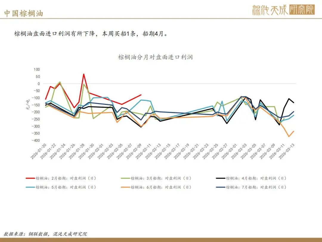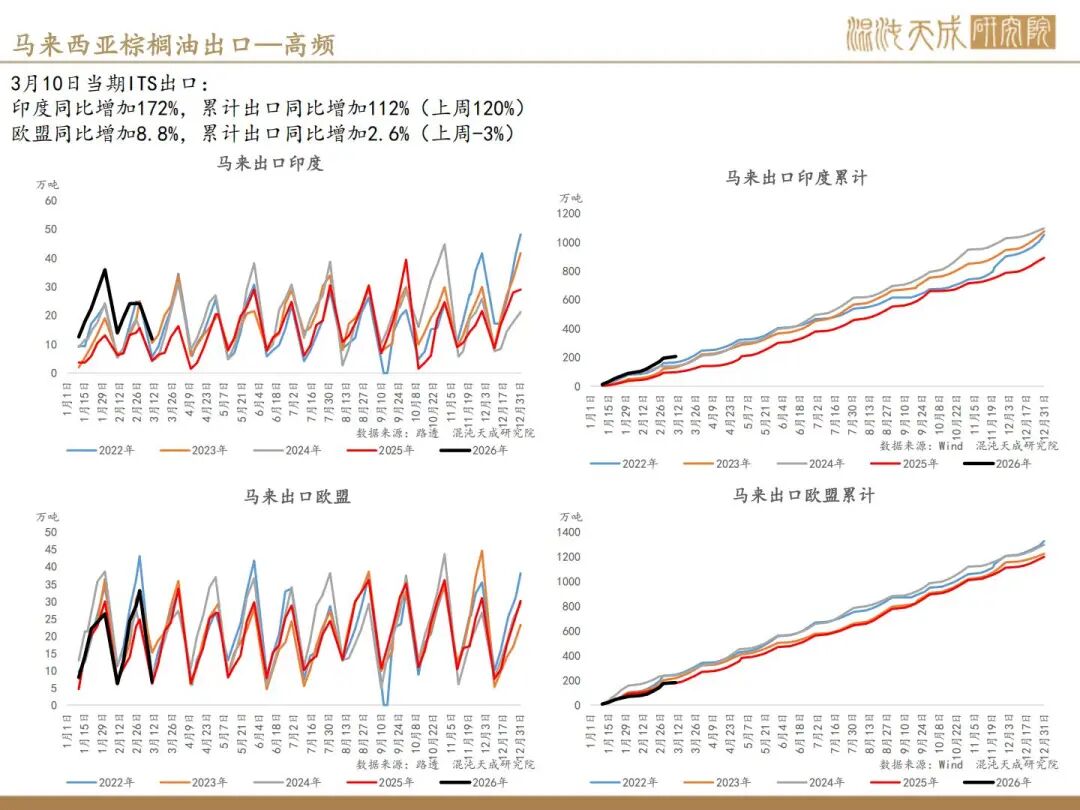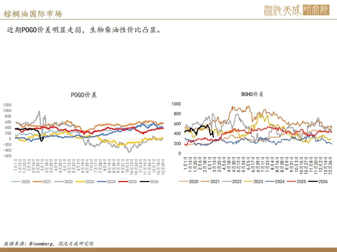 需求端:3月12日(路透社)——印度尼西亚生物燃料生产商协会APROBI表示,预计对50%棕榈基生物柴油混合燃料(即B50)的试运行最早将于能源(850101)部先前设定的目标日期——6月或7月前结束;印度尼西亚能源(850101)部副部长尤利奥特.丹戎表示,由于中东冲突导致原油价格飙升,印度尼西亚可能在今年年中恢复推出强制性B50级棕榈油生物柴油的计划;巴西农业和畜牧业联合会(CNA)近日向矿业和能源(850101)部提出申请,建议将柴油中的生物柴油强制掺混比例从目前的15%提高至17%,以应对国际油价上涨带来的影响;巴西矿业和能源(850101)部长Alexandre Silveira周四在新闻发布会上表示,在决定是否将柴油中的生物柴油混合比例从目前的15%进一步提高之前,巴西需要完成技术可行性研究;美国环境保护署(EPA)近期向白宫管理和预算办公室提交2026年生物燃料强制提案,最终规则将于3月底前敲定,并计划将此前小型炼油厂豁免的一半生物燃料义务转移到大型炼油厂;欧盟委员会已就《授权条例(EU)2019/807》的修订草案启动公众咨询,该草案拟逐步淘汰以棕榈油和豆油为原料生产的生物燃料,法案规定可计入能源(850101)消耗的棕榈油和豆油生物燃料份额将逐步削减:2025年降至71.4%,2027年降至42.8%,2029年降至14.3%,从2030年起,仅菜籽油生物燃料有资格计入配额;新的意大利生物燃料法规已获通过,该法规提高了2030年可再生燃料的强制要求标准,并撤销了对使用棕榈脂肪酸馏分原料的禁令,放宽了对使用源自废弃烹饪油的燃料的限制,并引入了10%的生物柴油混合燃料;德国立法将禁止使用以棕榈副产品为原料的生物燃料的禁令推迟至2027年实施,提振棕榈油未来需求预期;昨日新增买船0条,本周累计买船0条,上周国内棕榈油库存环比增加3.2%。