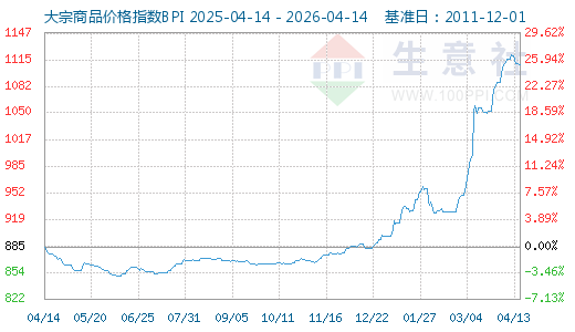 4月13日大宗商品价格指数BPI为1108点,较昨日下降了2点,较周期(883436)内最高点1343点(2021-10-19)下降了17.50%,较2016年02月03日最低点660点上涨了67.88%。