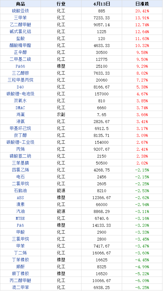 据生意社价格监测,2026年4月13日大宗商品价格涨跌榜中环比上升的商品共78种,集中在化工(850102)板块(共53种)和钢铁(850106)板块(共8种),涨幅在5%以上的商品主要集中在化工(850102)板块;涨幅前3的商品分别为异辛酸(23.47%)、硫酸亚铁(20.41%)、三甲苯(13.91%)。环比下降的商品共84种,集中在化工(850102)(共42种)和有色(共9种),跌幅在5%以上的商品主要集中在化工(850102)板块;跌幅前3的商品分别为十六酸(棕榈酸)(-11.54%)、混二甲苯(-6.25%)、丙二醇甲醚(-6.09%)。